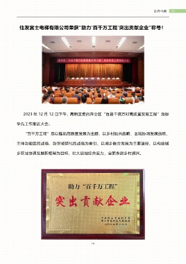 世界电梯 19 住友富士电梯有限公司荣获“助力‘百千万工程’突出贡献企业”称号! 2023 年 12 月 12 日下午,高明区委召开全区“百县千镇万村高质量发展工程”竞标 争先工作推进大会。 “百千万工程”是以推动高质量发展为主题,以乡村振兴战略、区域协调发展战略、 主体功能区的战略、新型城镇化的战略为牵引,以城乡融合发展为主要途径,以构建城 乡区域协调发展新格局为目标,壮大县域综合实力,全面推进乡村振兴。 19