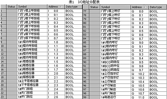 本系统是为一幢5层大楼所设计,根据PLC 的I/O节点使用原则,应留出一定的I/O点以做扩展时使用。系统中实际需要输入点47点,输出点40 点,因此我们选用西门子S7-300PLC,其中CPU的型号选为CPU315,输入模块的型号选为DI32xDC24V,总共需要两块,输出模块的型号选为DO32xDC24V/0.5A,总共也需要两块。I/O地址分配表如表1所示。