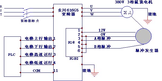 在PLC向变频器发出开关量控制信号的同时,为了满足电梯的要求,变频器又需要通过与鼠笼式曳引电动机同轴连接的脉冲发生器和PG卡, 对电动机完成速度检测及反馈,形成闭环系统。脉冲发生器输出A、B两相脉冲,PG卡接收到脉冲信号以后,再将此反馈给变频器内部,以便进行运算调节。根据A、B脉冲的相序,可判断出电动机的转动方向,并可以根据A、B脉冲的频率测得电动机的转速。由于本设计选用的是通用型变频器,因此其参数设置和外部线路设计的复杂程度要远远地高于电梯专用变频器,其设置的好坏也将直接影响到电梯运行的实际效果。
