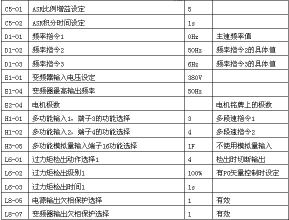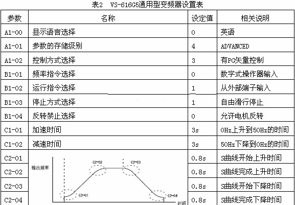 由于本控制系统选择的是有PG矢量控制,因此在运行之前,需要变频器对电机单体进行自学习,否则变频器将不能正常工作。其具体做法是先将电机铭牌上面记载的额定电压、额定电流、额定频率、额定转数、PG卡脉冲数及电机极数输入至变频器,然后启动变频器,使电机空载运转,最后这些数值通过自学习,自动地计算后写入到变频器的电机参数中。因此对于这些参数,没有必要去人工进行设置。 VS-616G5通用型变频器设置如表2所示。