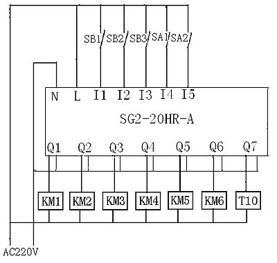 SG2的接线:SG2的电源电压范围为110~240VAC。它可以直接输入交流220V 电压做为输入电源。输入端子分别为I1~I8、A1~A4。输出端子为Q1~Q8,在此自动扶梯控制系统中只用了输入I1-I5(与按扭接点连接),输出Q1~Q7(与接触器线圈连接)。