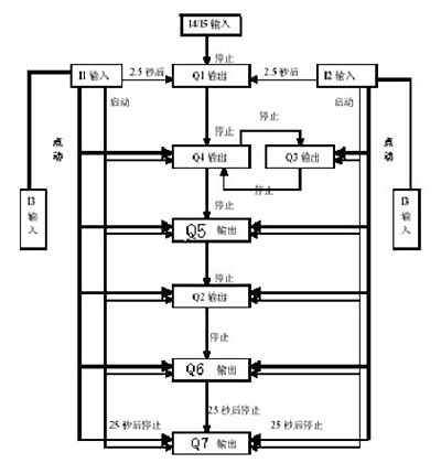 当按下SB2 按钮下行(I2 输入信号有效)时输出主Q3,连锁停止Q4,其它与上相同。(Q3 与Q4 和Q1 与Q2 的输出是互锁的)