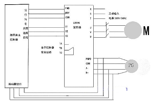控制方式:首先由控制器根据实际需要给出正/反转运行信号,对应电梯的上行/下行,再给出抱闸信号,使曳引机松闸,变频器在零速给出力矩,使轿厢与对重相对平衡,接下去控制器根据要到达的层楼相应给出速度选择信号,变频器中的X1,X2,X3根据端子给定给出运行频率,运行过程中给出减速信号,平层信号,变频器根据给定的速度选择信号,相应的调节输出频率直到停止。