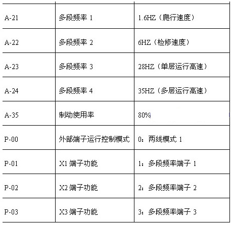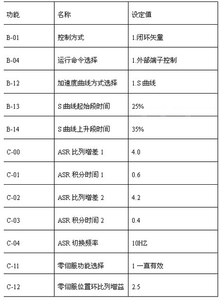 电梯调试中对舒适度要求很高,客梯要求更高,所以在调试中对变频器的速度曲线使用了S曲线,控制器在启动和停机过程中会有一定的零速间隔时间,于是开启了零伺服功能,保证变频器在设置频率为0时,仍有足够大的力矩输出,由于有编码器脉冲反馈,使用了闭环矢量控制,具体调试过程中分为几个步骤:首先请电梯公司工程调试人员将箱吊起来,输入电机铭牌参数,并进行电机参数自学习,然后电梯重新安装好,进行参数设置,并试运行,进一步修正变频器参数,使电梯运行达到满意的效果,部分主要功能参数设定如下: