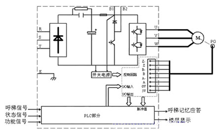 PLC作为逻辑控制部件,与驱动部分通讯采用开关量而不用模拟量。曳引电动机的转速控制是闭环的,其转速的检测由和电动机同轴旋转的光电编码器完成,这样保证了平层的精度以及运行的可靠性。在系统启动时自学习的过程,PLC通过编码器记忆各点的位置,实际使用时PLC根据运行距离,决定运行的速度。