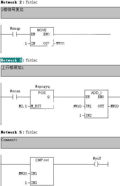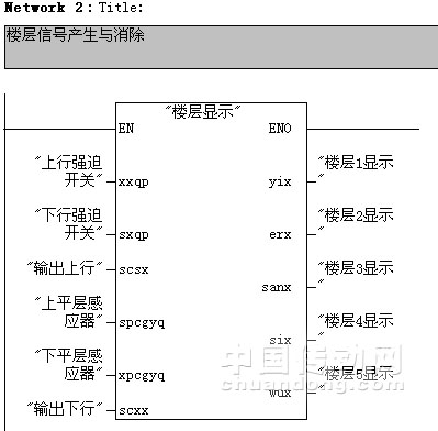 #p##e#⑵当电梯位于某一层时,应产生位于该层的楼层信号,以控制楼层显示器显示楼层处的位置,离开该层时,该信号应被新的楼层信号(上一层或下一层)取代。电梯的楼层数存放在MW20中。“#sxqpkg”是上强迫行程开关的形参,当电梯到达5楼时,使MW20为5。“#xxqpkg”是下强迫行程开关,当电梯到达1楼时,使MW20为1。在中间,电梯上行时,每上一层,MW20加1;电梯下行时,每下一层,MW20减1。如果层显有误,只要将电梯开到顶层或1层,马上就能显示正常[2] [3]。梯形图如图4所示。