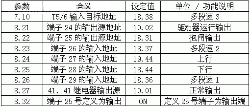 电梯运行原理:首先由控制器根据实际需要给出正/反转运行信号,对应电梯的上行/下行,再给出抱闸信号,使曳引机松闸, ES驱动器在零速给出力矩,使轿厢与对重相对平衡,接下去控制器根据到达的层楼相应给出速度选择信号,ES给定出运行频率,运行过程中给出减速信号,平层信号,最后ES根据给定的速度选择信号,相应的调节输出频率直到停止。ES输入信号为:上,下行方向指令,爬行,低速,高速,检修速度等各种速度编码指令,复位和使能信号。ES输出信号为:驱动器准备就绪信号和运行中信号。下面是根据图1设定的ES端子接口参数表: