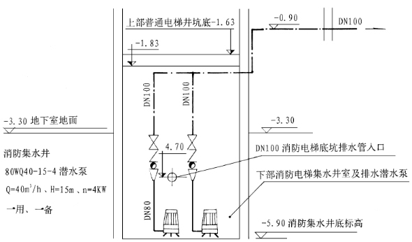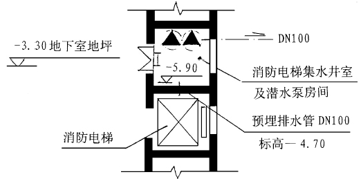 2.在消防电梯井坑底设一横向排水管, 将水引至地下室一角落处的开口深坑内, 再设潜水泵排水, 如上海工业高层厂房电脑刺锈厂等。