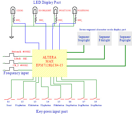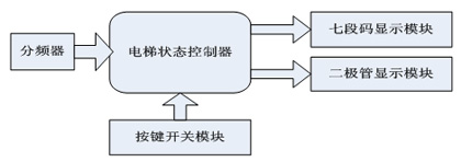 整个电梯控制系统将由一片CPLD来实现。外围的电路主要包括:分频器,七段数码显示模块、发光二极管显示模块,以及按键开关模块。