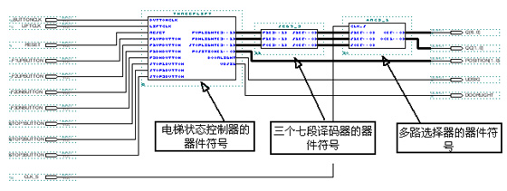 各模块的功能:电梯状态控制模块,是整个系统设计的核心,完成电梯的状态控制;显示模块,主要是将系统信息显示出来,判断电梯运行是否正常;分频器模块,由4MHZ的原始频率分频得到系统所需要的频率;按键开关模块,消除由于机械按键输入的误操作和防抖动。