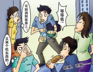 8时40分,一位身穿T恤背着包的年轻男子,拿着半杯豆浆和一块煎饼,边吃边冲进临江门怡景大厦C栋电梯。该男子嘴角沾着一滴豆浆,满嘴是油,大口咀嚼发出“吧唧吧唧”的声音,油炸煎饼散发出阵阵油腻味充满整个电梯,电梯里乘客们纷纷皱起了眉头,有的甚至用手捂起鼻子,但没有一人出面制止。电梯行至14楼,一位年轻女子咀嚼着饼干走进电梯,“咯嘣咯嘣”的声音不绝于耳。