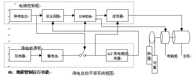 当供电电网发生停电时,电梯所配置的停电电源柜(ALP)自动投入,通过回路的切换,将停电电源柜中的蓄电池的电能经过逆变后供给电梯的控制回路和电动机,恢复轿厢内照明与风扇;电梯根据轿厢的负载情况,自动选向(若轿厢载重量<50%,选择上行方向;若轿厢载重量≥50%,选择下行方向),并以低速运行到最近层楼平层位置,自动停车开门,然后熄灭电梯轿厢的照明和风扇,并保持开门状态,以便使用停电而被困的乘客走出轿厢。
