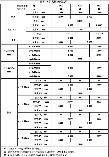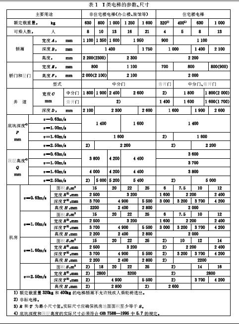 一类电梯:非住宅楼电梯的轿厢、井道、机房的型式与尺寸见表