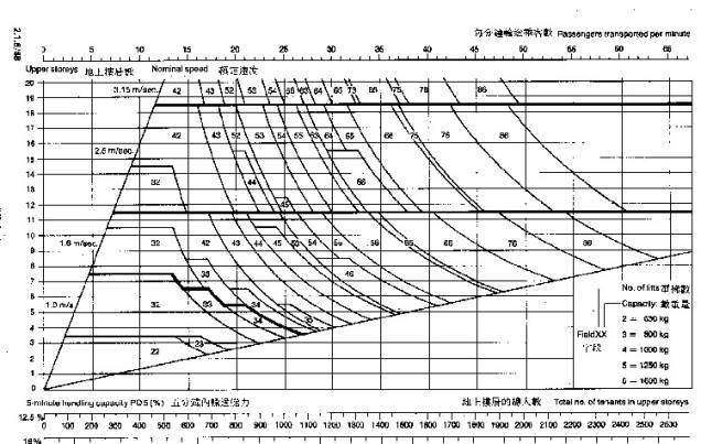 在这些图表中曲线内包含的为两个阿拉伯数字,第一个阿拉伯数字表示所需电梯数量,第二个阿拉伯数字表示这些电梯的载重量(参见图上的解释),额定速度在图的左边线上表示。