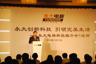 2009年7月29日下午,上海永大电梯设备有限公司在成都香格里拉大酒店锦官城会议厅举行了主题为“永大创新生活 引领完美生活”成都新品推介会。风景旖旎的成都是四川省的省会城市,也是西部地区的经济、金融、文化、教育中心,正经历着日新月异的变化和发展,因此对于基础建设所需要的电梯及电扶梯的需求也开始增加。此次活动旨在把永大电梯的最新产品展示给用户。与会者来自成都、重庆、西安等西部主要城市,包括房地产开发商、代理商、政府官员以及媒体朋友共200多人参加了本次会议。会议嘉宾中包括了省市残联、残疾人基金会、台办及省技监局领导,另外都江堰友爱学校校长作为特邀嘉宾也出席了本次会议。