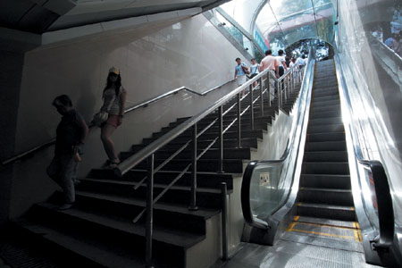 中山广场东西两侧各有2个通道,每个通道设置一部自动扶梯。记者采访时看到,东通道通往交通银行方向的自动扶梯无法使用。因为旁边的楼梯也比较狭窄,无法容很多人通过,有的市民就在停止运行的自动扶梯上下。自动扶梯台阶高,表面不平整,步行的安全系数大打折扣。