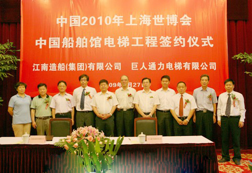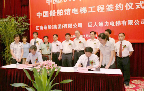 7月27日下午15时,巨人通力电梯有限公司与拥有140多年历史并有着“中国第一厂”之称的江南造船(集团)有限公司就“中国2010年上海世博会中国船舶馆”电梯项目在上海江南造船大厦举行了隆重的签约仪式,第九届政协浙江省委员会常委、上海市各省市自治区和中央各部驻沪办事处经济合作协会名誉理事长曹大立先生,浙江省人民政府驻上海办事处副主任傅元安先生等领导,江南造船(集团)有限公司党委书记、上海世博会中国船舶馆副馆长龚汉明先生,巨人通力电梯有限公司董事长钱江先生以及双方代表等出席并见证了本次签约仪式。