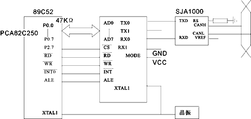CAN接口电路如图2所示, SJA1000是PHILIPS公司生产的独立CAN通信控制器,SJA1000集成了CAN协议的物理层和数据链路层功能,可完成对通信数据的成帧处理,该控制器具有多主结构、总线访问优先权、硬件滤波等特点。PCA82C250是CAN 协议控制器和物理总线的接口,它可以提供总线的差动发送能力和接收能力,高速应用可达1M baud,最多可挂110个节点。