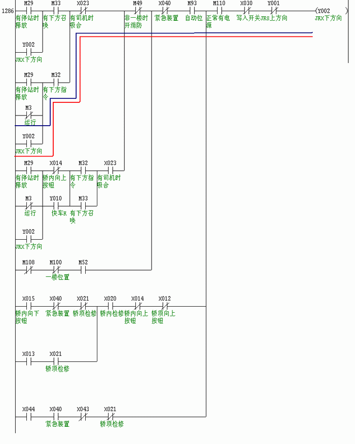 说明:电梯在正常无司机状态,当下方有指令时,M32动作,促使电梯自动定向为下方向(见蓝线),Y2动作并保持(见红线),下方向灯点亮。