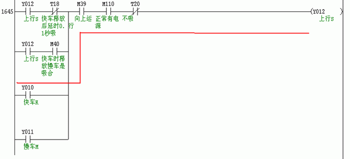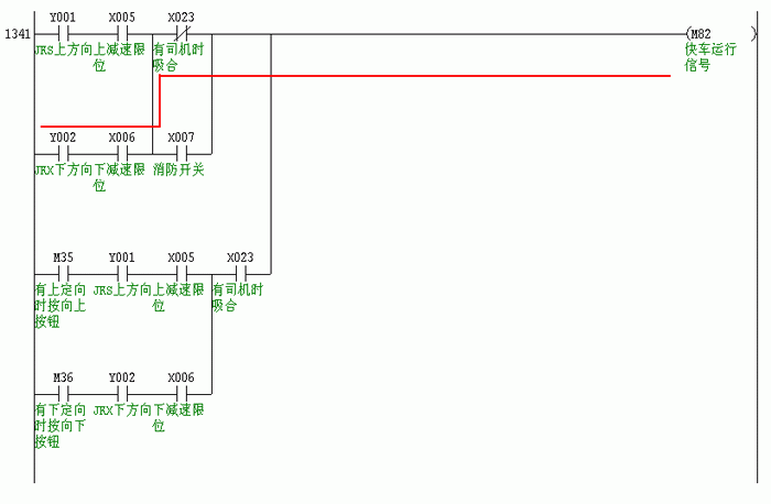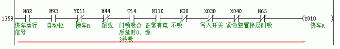 说明:当下方向Y2吸合,通过红线所示方向促使快车运行信号M82吸合。