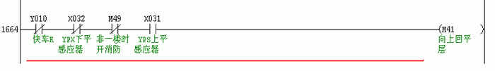 当电梯上平层感应器插入隔磁板,X31吸合,下平层感应器未插入,X32释放的状态下,电梯在没有启动时,Y10释放,因此向上回平层继电器M41吸合。