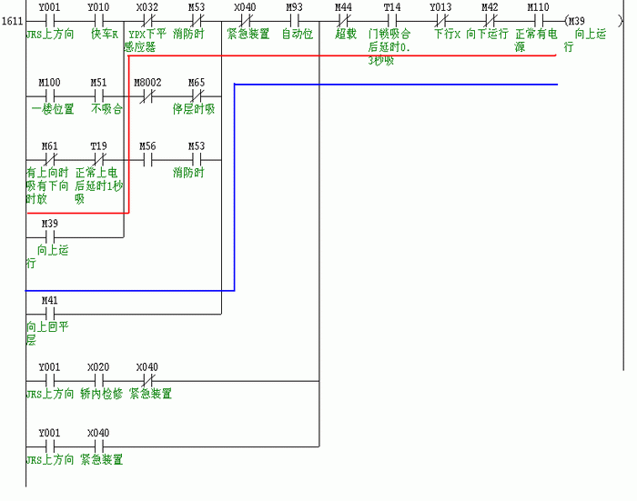 电梯在还没有启动时,如果向上回平层继电器M41吸合,则M39吸合(蓝线),M39吸合后能保持,(见红线)。