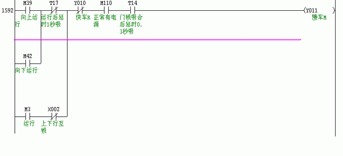 在同一个梯形图中,我们看到如果快车接触器Y10没有吸合的情况下,慢车接触器Y11应该吸合(见粉色线),但请注意这里的梯形图程序步数在1592,在快车接触器Y10之后。