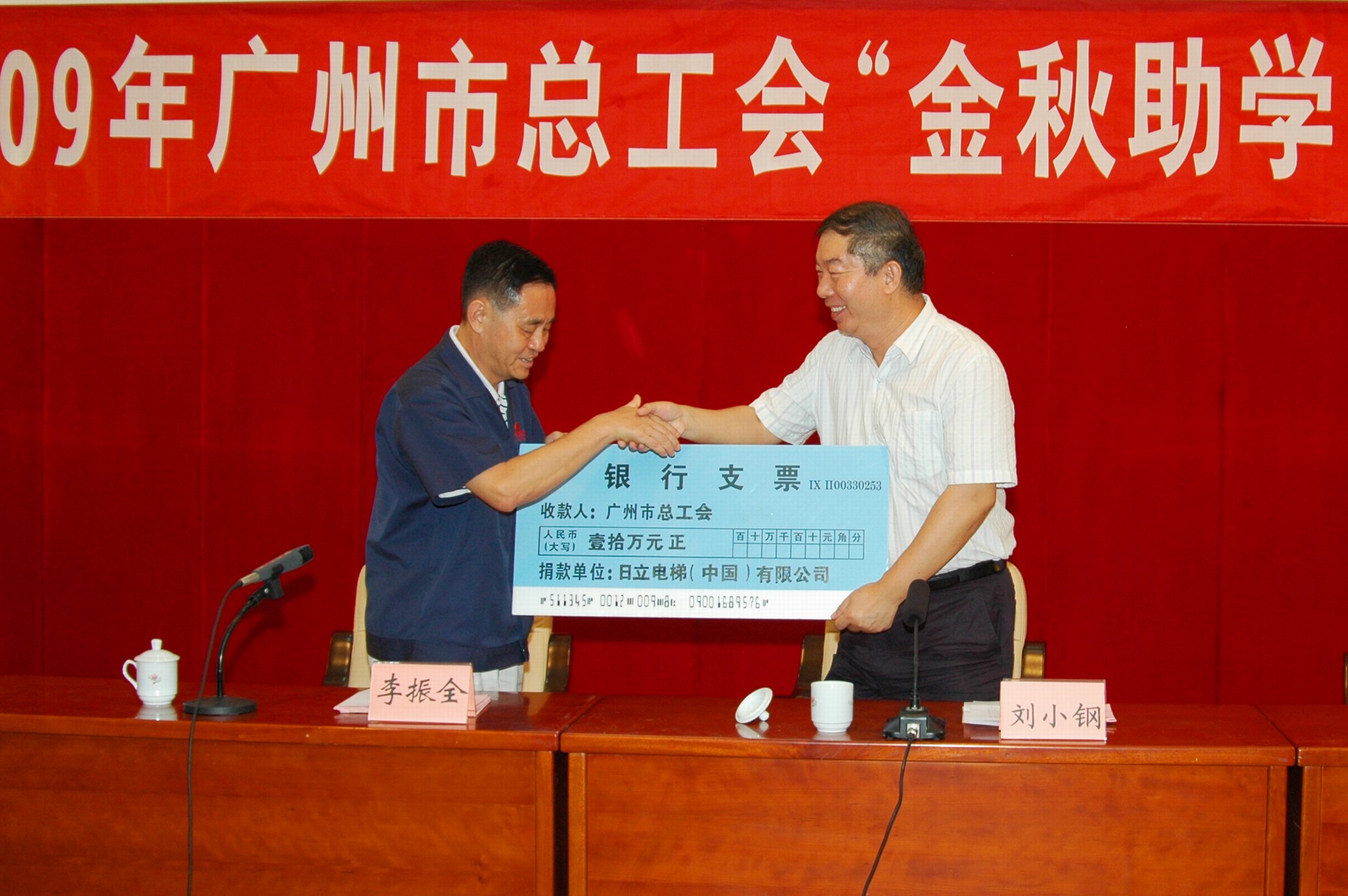 2009年8月24日,日立电梯(中国)有限公司再次携手市总工会举办“金秋助学”活动。公司捐资10万元,资助今年首批131名困难职工家庭大学生。