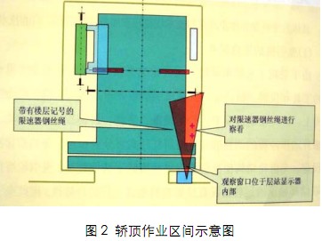 在轿顶防护栏没有展开之前,禁止踏上轿顶工作,否则会有坠落危险。在轿顶作业过程中,当轿厢移动时,身体任何部件不允许超出防护栏范围。在离开轿顶之前,应确认轿顶上是否有松动的部件,防止活动部件附落,造成底坑内工作人员受到意外伤害。轿顶作业区间如图 2所示。