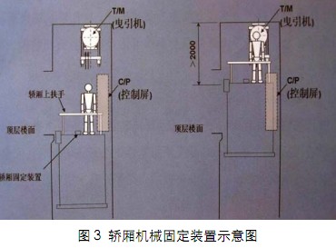 当对无机房电梯的曳引机和控制屏进行维修保养时,由于操作人员是站在井道内的轿顶上而非机房地面,因此轿厢应该以机械方式固定在导轨上,以消除由于轿厢意外移动而产生的危险。为此,ELENESSA 无机房电梯提供了一套轿厢机械固定装置(如图 3 所示) ,该装置位于轿顶上靠曳引机的一侧,能够将轿厢固定在以下任一位置:a)可以对控制屏进行维护保养。在这个位置上,轿顶平面位置大致与顶层平层平齐;b)可以对曳引机进行维护保养。在这个位置上,轿顶平面位于井道顶部下约 2m处。 使用轿厢固定装置的操作步骤如下:①将轿厢运行到上述任一位置。这些位置可以通过固定在导轨上的用以插入轿厢固定装置的固定板来辩别;②翻动轿厢固定装置,将其从“收拢位置”转换到“设定位置” 。固定装置上的固定件应该完全插入导轨上固定板的孔内;③翻动轿厢固定装置使其脱离“收拢位置”时,轿厢所有的电气操作将自动失效;④在使用轿厢固定装置时应注意此时轿厢顶上有最大允许负载条件,确保安全可靠。