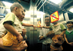 已有不少公共场所和住宅小区的电梯里贴上了警示标志