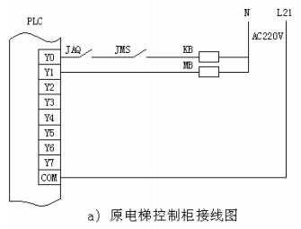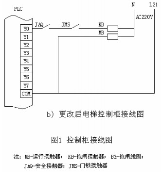 根据厂家的解释,造成变频器保护的原因是因为 MB 和 KB 的动作无法协调造成的,按照原先的设计方案,KB 和MB 分别由 PLC 的两个输出点控制抱闸的开启和电梯的运行,但是由于程序不成熟,无法有效地控制 KB 和 MB。在故障无法排除的情况下,也不知道是哪一方,私自更改线路,接成(图 1b)的样子。直到现在,是谁改线这个责任还在厂家、代理商和用户之间相互推脱,都不承担责任,因为没有造成人员伤亡,最后不了了之。