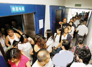 记者发现,运行的单层电梯只能容10人,运行约10分钟才能载客1次,每次上楼,要多挤两三人,遇性急的年轻人插队,常与保安和排队居民发生口角。