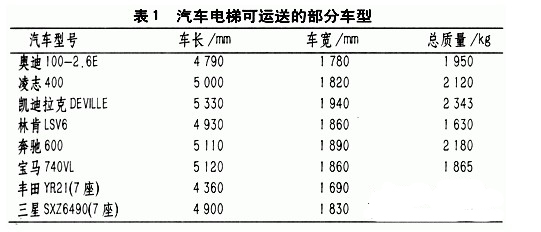 汽车电梯的轿厢面积和载重量的计算不同于客货梯的标准,汽车电梯的轿厢应设计成狭长状,以满足汽车的进出与停泊。在查阅了国内使用的众多品牌的小轿车和7座以下小型面包车的外型尺寸后,最终确定了轿厢尺寸为2 750mm(W)×6 300mm(D),额定载重量为2 600kg。这种轿厢尺寸和载重量的配置可以满足以下车辆进出,见表1。