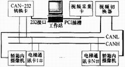 电梯远程监控系统由3部分组成:数据采集卡,视频监控,监控工作站组成,其总体方案结构如图1所示。数据采集卡(图1中的CAN-232数据转换卡)与电梯控制器中负责与监控系统进行数据交换的电梯通讯卡通过CAN总线进行连接,布线方式采用总线式。如果总线长超过100米,那么在总线末端应该接120欧的抑制信号反射的终端电阻。这两个120Ω的电阻,对匹配总线阻抗起着相当重要的作用。忽略掉它们,会使数据通信的抗干扰性和可靠性大大降低,甚至无法通信,这一点在现场已经得到了验证。数据采集卡通过RS232总线连接工作站的COM1口,与工作站进行数据通信。