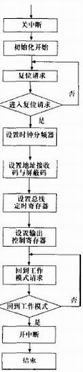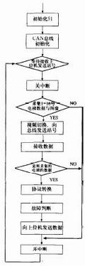 在CAN总线通信中,初始化模块较为重要,是一个重点,也是难点。在初始化时,首先进入复位模式,然后对CAN控制器的寄存器配置。但在实际中发现硬复位较可靠,只要时间足够,一定能使CAN控制器进人复位状态,但此时CAN控制器的某些寄存器的值不确定。软复位正好相反,不一定能使CAN控制器进人复位状态,但一旦进人复位状态则CAN控制器的寄存器数值就为确定的复位值。在实际应用中此两种复位方法结合使用效果好。因此,在硬件电路中还设计了Watchdog电路,它同时还可以防止单片机死机或者程序出现“跑飞”现象发生。初始化程序流程图如图2所示,采集卡整体程序流程图如图3所示。