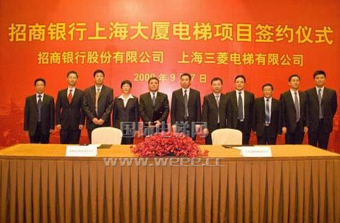 两个同龄人——同是22岁的招商银行和上海三菱电梯有限公司在金茂大厦举行了“招商银行上海大厦电梯项目签约仪式”。继上海三菱为招商银行信用卡中心提供52台电梯后,招商银行又在上海浦东建造招商银行上海大厦。经过严格的招标程序以及招商银行的精心的选择,上海三菱又将为招商银行提供包括10台6m/s高速电梯在内的35台最新型的节能、环保、高效的电梯扶梯产品。