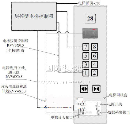 电梯控制器:是 IC 卡控制器的主要控制模块,安装在电梯轿顶,用于接收、识别、处理由读卡器传输的IC卡信息,并且对电梯内召按键进行控制;控制器与电梯采用干触点方式进行连接,故IC卡系统与电梯本身无电气连接,安全可靠;并且在特定条件下(如电梯维修、火警时)控制器也可以解除对电梯按键的控制。