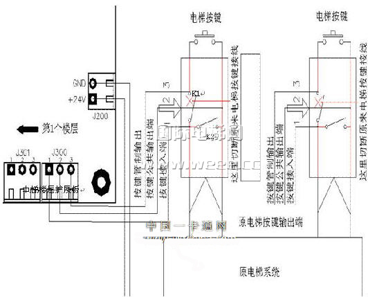 原理说明:方框中的部分等效为楼层扩展板内部结构,电梯受控制系统管制时K1断开,用户无法使用电梯按键,当单层用户刷卡时,K2闭合相当于用户已经按下电梯按键,当多层用户刷卡时K1闭合,等待用户选择目的楼层。当消防状态或者电梯控制系统掉电K1闭合,K2断开,电梯控制系统自动脱离,电梯恢复普通电梯,任何人都能正常使用电梯