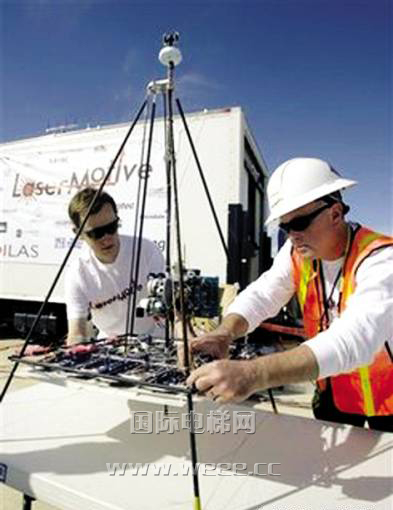 图为其中一队的领队大卫·巴什福德近日率队员准备操控激光动能的机器攀爬机爬上直升机上悬挂的缆绳,行程900米。
