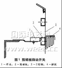 图1所示,是一种装在围裙板之后的安全保护微动开关。自动扶梯正常工作时,围裙板2与梯级4间保持一定间隙,单边不大于4mm,两边之和不大于7mm。为保证乘客的安全,在围裙板的背面安装c形钢,离c形钢一定距离处设置开关,当异物进人围裙板与梯级之间的缝隙后,围裙板发生变形,c形钢也随之移动,达到一定位置后,碰击开关1,自动扶梯立即停止运行。