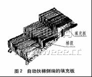 图2所示,是在梯级两侧各装一块由塑料及干润滑剂配制而成的填充板,其形状与梯级相匹配。填充板由弹簧或拉杆保持其位置,并在自动扶梯的全行程范围内与围裙板相接触,填满了自动扶梯围裙板与梯级两侧之间的间隙,其安全保护作用是明显的。