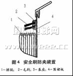 图4所示,是在围裙板上装设安全刷。安全刷防夹装置由基座和毛刷组成,基座不带有尖锐的边缘且能方便地卸下,毛刷既柔软又有一定的硬度,不伤衣物,在乘客的鞋子碰到毛刷后会自动复原。