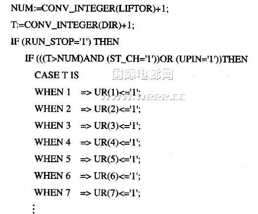 在楼层请求寄存器的置位与复位进程”的设计中,通过楼层选择指示变量DR,电梯所在楼层变量LIFTOR和输入信号UPIN、DOWNIN、ST_CH来判断UR、DR的置位。其判断原则为:若电梯所在楼层为NUM,假设电梯处于运行中,这时若楼层选择指示为T且T)NUM时按下了楼层选择确认键ST_CH,或者按下了上升按键UPIN,则对应的上升请求寄存器UR(T)置为“1”,否则,若电梯运行时间到(HAND=T,亦即WAI_T=''101'')且没有任何请求,则对应的上升请求寄存器UR(T)置为“0”;若电梯所在楼层为NUM,假设电梯处于运行中,这时若楼层选择指示为T且T 。