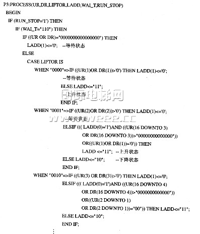 在电梯运行次态的控制进程P3的设计中,根据URiDR的寄存器状态和电梯所在楼层变量LIFTOR,当WAI+T=''110''时,给出电梯的下一个状态。LADD为电梯的下一状态的指示变量,“11”表示上升,“10”表示下降,“01”或“∞”表示等待状态。其设计思路为:若电梯在运行状态(即RUN_STOP='1'),假设运行时间到(即WAI_T=''110''),如果这时上升寄存器或下降寄存器均等于零(即(UR OR DR)=''0000000000000000''),则电梯处于等待状态(LADD(1)<='0');否则,若电梯处于第N层,这时若N+1层的上升或下降寄存器有请求,则电梯处于运行等待状态(即LADD(1)<='0'),这时若N+1层以上的上升或下降寄存器有请求或是N层及以下的上升或下降寄存器有请求,电梯处于运行上升状态(即LADD(=''11''),其余情况电梯处于下降状态(即LADD<=''11'')。有关的具体语句如下(详细请见前述的VHDL程序):