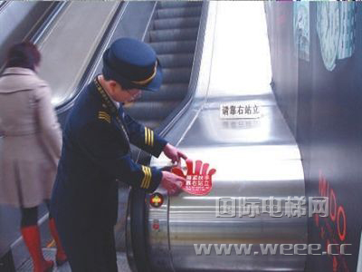 近日,地铁1号线复兴门站区内所辖4个车站的扶梯上加贴了一种手形提示标识。40个标识用于提醒乘客注意乘梯安全。