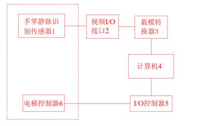 电梯手掌静脉自动识别装置安装有设置于电梯操纵箱,或称为外呼盒上的手掌静脉识别传感器1,传感器1将通过近红外线照射手掌,近红外线经过近距离接收、处理、提取特征生成手掌静脉特征图,并生成视频信号后依次通过视频I/O接口2、数模转换器3输入到计算机4,计算机4将静脉特征图通过与存储器中静脉存储样进行对比与匹配手掌静脉特征得到识别结果传送给I/O控制器5,I/O控制器5将处理好的信号通过通讯传输给电梯控制器6驱动电梯轿厢到达指定楼层。