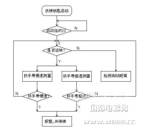 台达PLC DVP-60ES有4个单独的32位高速计数器,这为扶梯的高速计数控制做好了准备。扶梯的高速计数主要有2个方面,一个是主机测速,另一个是扶手带测速。主机测速有专门的测速器,扶手带测速则可以通过2个高速计数器测量扶手带的速度,用2个高速计数器扑捉扶梯梯路运行的速度。这2对高速计数器形成了2路扶手带的测量,彼此独立,互不干涉,资源充足。见如下控制流程图:
