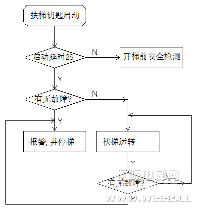 1)开机前的安全回路检测。外围安全回路的检测完好是扶梯运行的基础。外围安全回路断开,则停止一切与主机运行的输出。