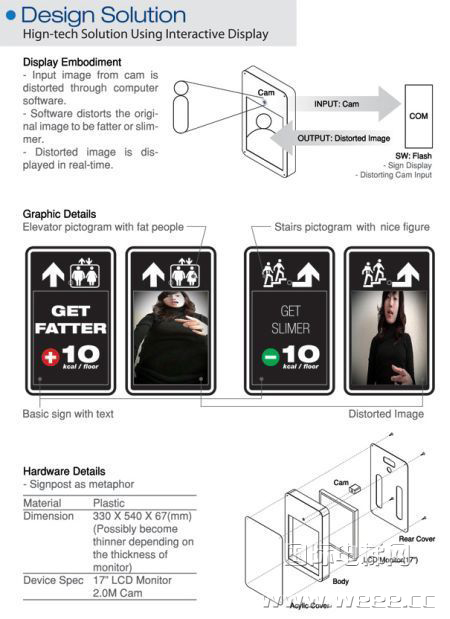 这款健康提示牌适合安装在电梯边上。提示牌上留有摄像头,当感应到有人靠近电梯的时候,它就会从休眠中启动,拍摄镜头前等待电梯的人像,然后将变形后的人像配合文字、图案标识在提示牌上播放——如果您搭乘电梯,长此以外您就会变胖;而若是选择爬楼梯,那么您就可以保持窈窕身材。看到这么直观的提示,若是不赶时间,想必爱美的女士们都会选择楼梯登高吧?
